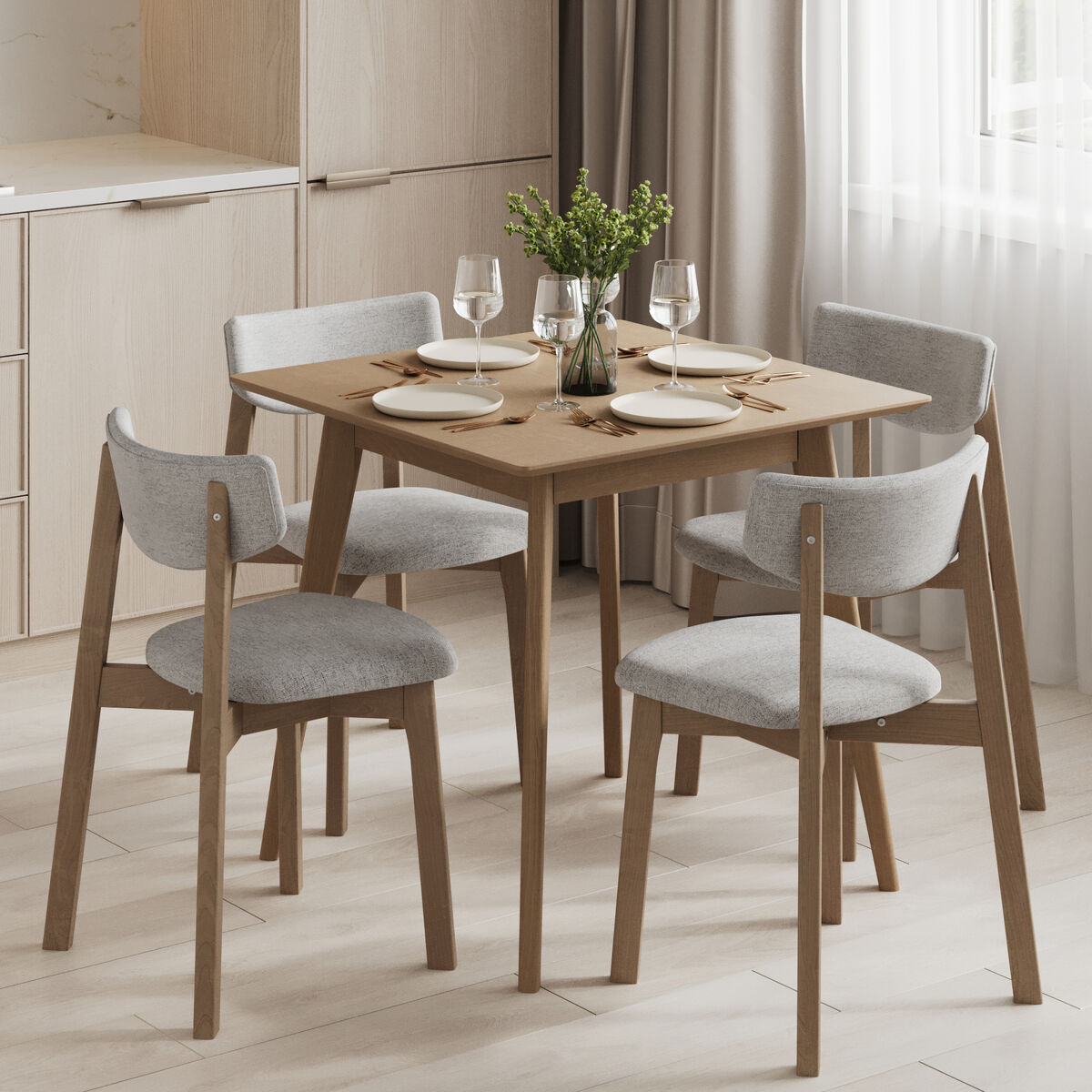 Строгая квадратная столешница с закругленными краями и изящные прямые опоры.