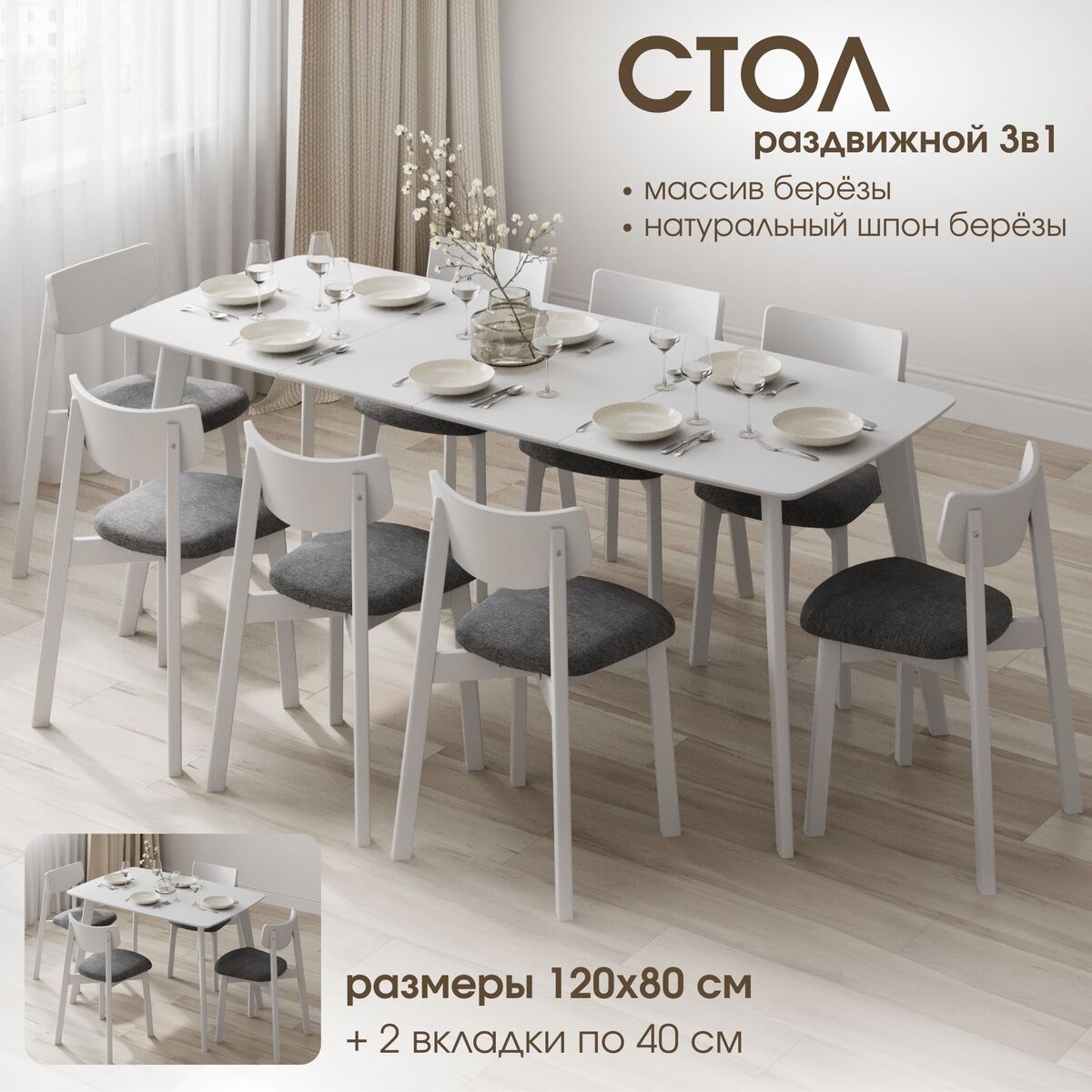 Надежный раздвижной механизм c деревянными направляющими скрыт внутри и позволяет быстро трансформировать стол.